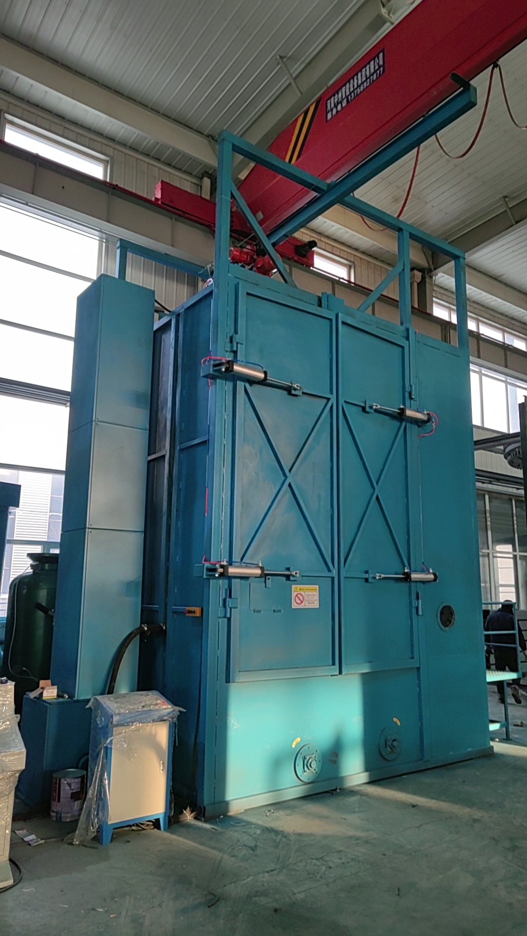 吊钩式清理设备,由抛丸清理室、提升机、分离器、螺旋输送器、两个抛丸器总成、弹丸控制系统、吊钩行走轨道、吊钩系统、自转装置、地基、除尘系统及电气控制部分等组成