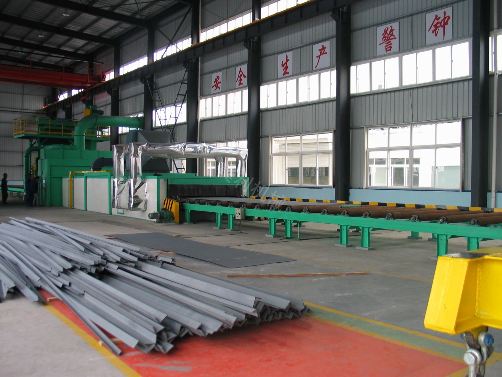型材通过式抛丸机是一种清理焊接结构件、H钢、型钢、网架钢板的多功能钢材予处理线。抛丸器布置形式为多角度,选用了世界上先进的双元盘叶片高效抛丸器,抛射出高速密集的弹丸束,打击在原始状态钢材的各个部位,进行立体的、全方位的清理,使钢材各表面上的锈蚀层、焊渣、氧化皮及其污物迅速脱落,获得一定粗糙度的光洁表面,提高了漆膜与钢材表面的附着力,并提高钢材的抗疲劳强度和抗腐蚀能力,改善了钢材内在质量,延长其使用寿命。 本机主要功能部件是清理室,室内输送辊道与进出料输送辊道、抛丸器、弹丸循环系统(含提升机、分离器、纵横螺旋输送器及弹丸回收机构和供丸管道)吹扫机构、除尘、电气控制等部件组成。