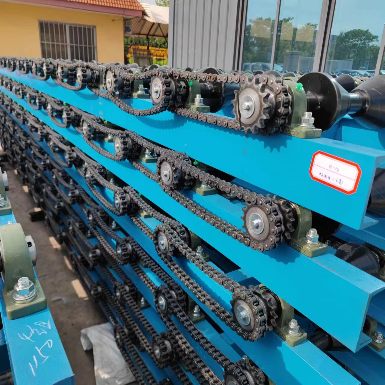 物流线必须符合坚固耐用、抗冲击能力强、耐磨损、可保证不同规格的钢瓶都能输送顺畅:支架用型钢焊接而成,牢固可靠刚性好,动力采用减速机驱动,可正反双向输送,满足了生产线需要。